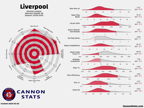 Liverpool’s performance metrics for the 2024-25 Premier League season after 18 matches. The radar chart and distribution data highlight Liverpool’s attacking dominance, with standout metrics in Non-Penalty xG (2.12 per game) and Open Play Shots (13.3 per game), alongside strong defensive contributions. Data and visualization courtesy of Cannon Stats