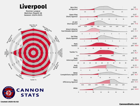 Liverpool’s defensive performance metrics for the 2024-25 Premier League season after 18 matches. The radar chart and distribution data emphasize Liverpool’s strong defensive structure, with standout metrics in Non-Penalty xG Against (1.0 per game), PPDA (9.7), and Pressing Efficiency (96.6%). Data and visualization courtesy of Cannon Stats.