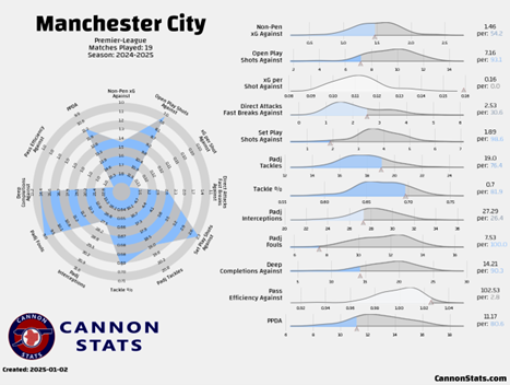 Manchester City’s defensive performance metrics for the 2024-25 Premier League season after 19 matches. The radar chart and distribution data highlight City’s strong pressing efficiency (102.3) and low Non-Penalty xG Against (1.46 per game), reflecting their disciplined defensive structure. Data and visualization courtesy of Cannon Stats.