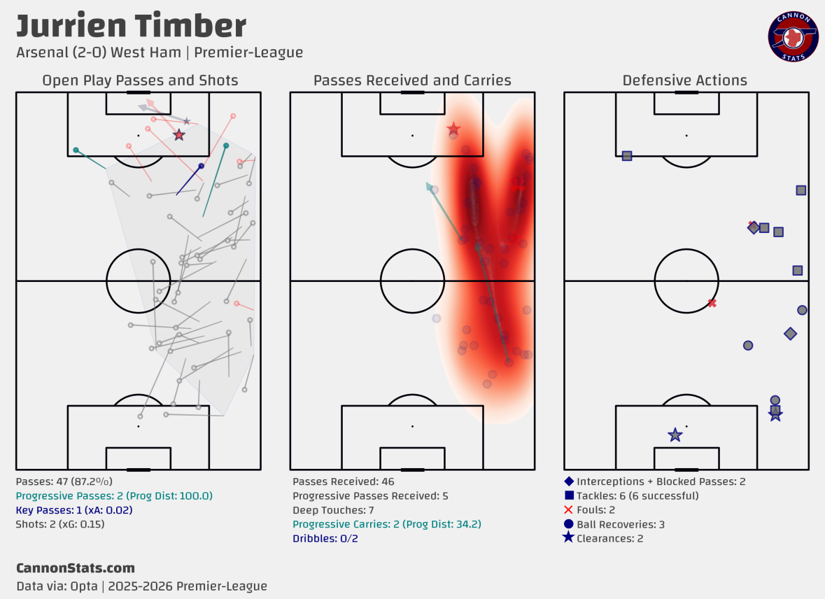 Against Manchester City, Saka had 11 progressive carries and eight deep touches. Timber added five progressive passes and six carries. Newcastle followed the same pattern. Saka made 29 receptions and seven carries, Timber seven progressive passes and two shots. West Ham confirmed the template, with Saka’s seven deep touches and four shots supported by Timber’s six successful tackles and two carries. The pattern is not improvisation. It is the method by which Arsenal control territory and chance creation.