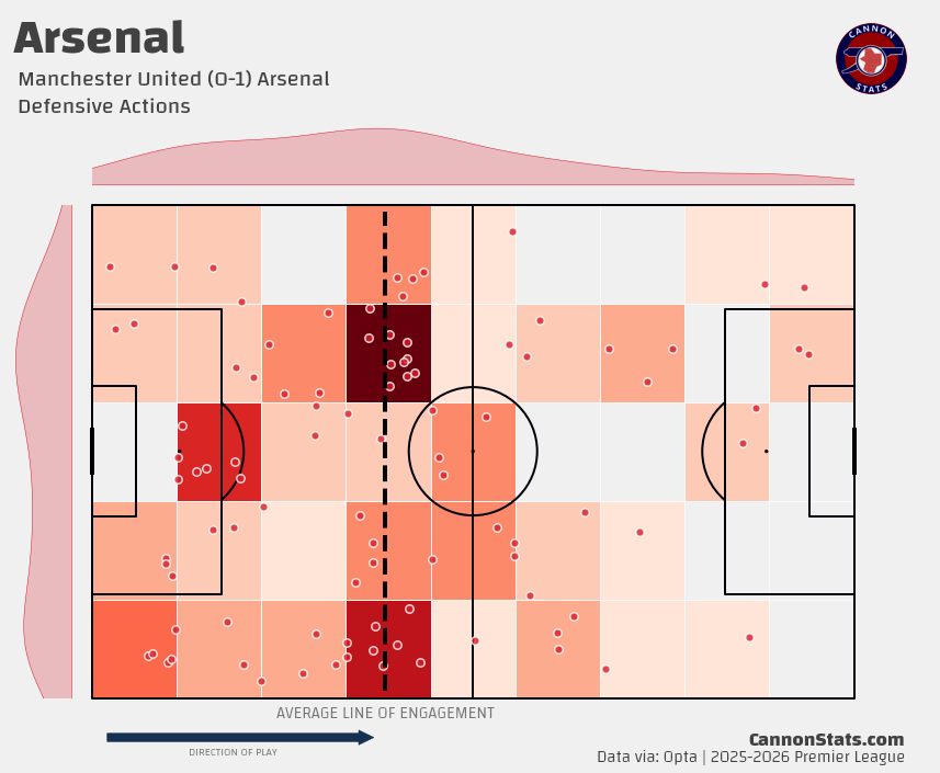 Arsenal’s defensive actions vs Manchester United show a clear concentration in wide areas, with the back line holding firm centrally. Data via Cannon Stats.