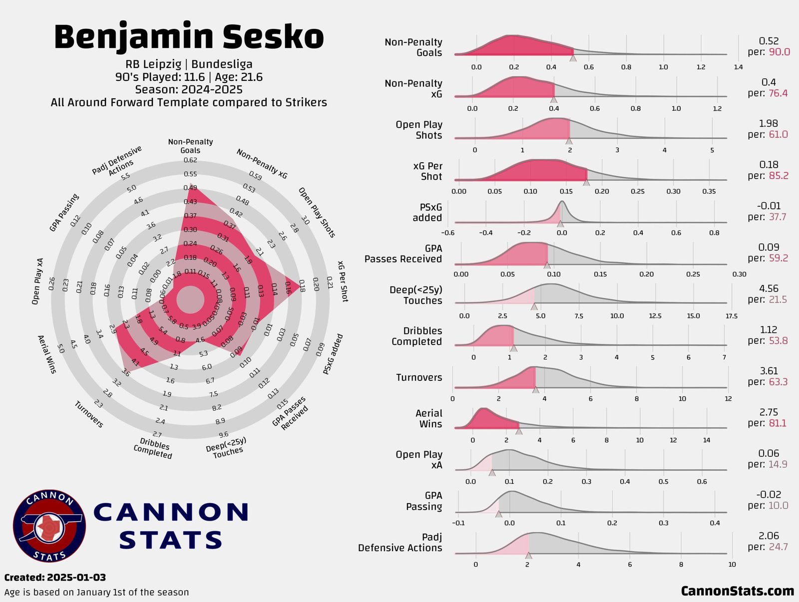 Benjamin Šeško’s performance metrics for the 2024-2025 Bundesliga season illustrate his strengths as a well-rounded forward, excelling in non-penalty goals, aerial wins, and deep touches while highlighting areas for growth in passing and turnovers. Data visualization courtesy of Cannon StatsHow Šeško Fits at Arsenal