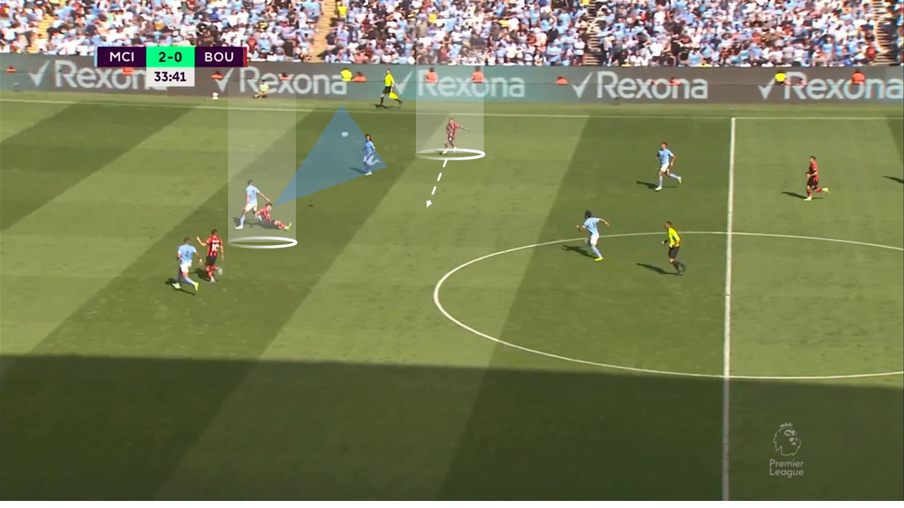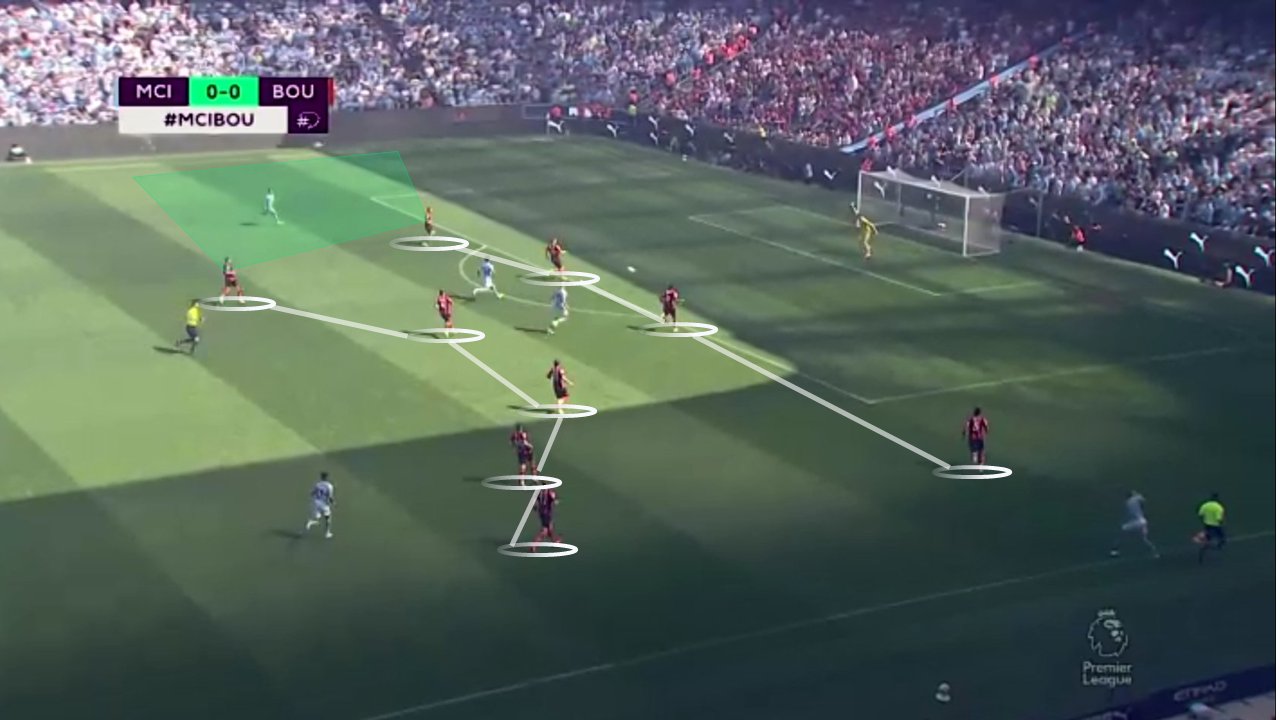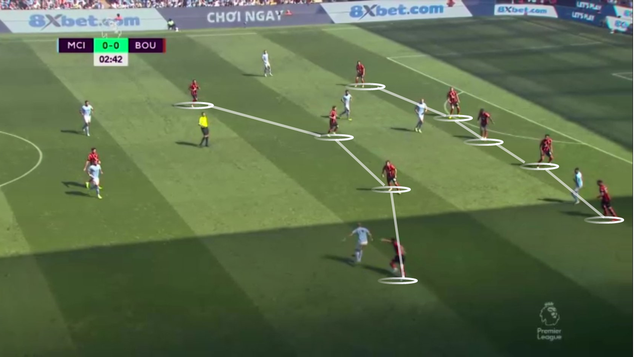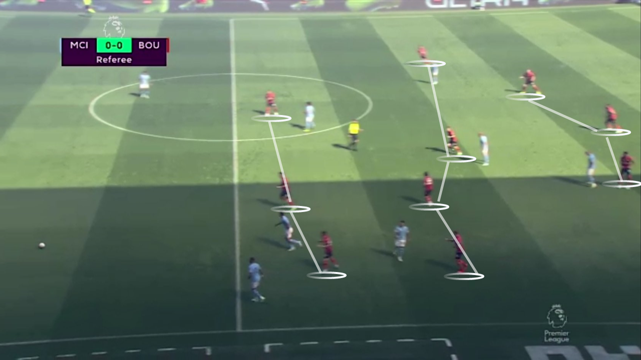 In defense, Bournemouth wants to stay in a mid/low block and get very aggressive with passes into central areas, looking to create turnovers and quickly transition into offensive areas, using the ability of their frontmen to get into shooting positions. Under prolonged pressure, the Cherries drops into a 541 formation, looking to close the space in and around the penalty area. While this low block approach does take more effort to break down, it does also invite the opposition to keep them pinned into their own half. As thus, there’s a big emphasis on breaking forward when the opportunity comes.