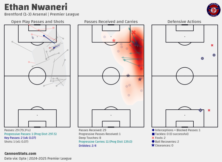 Ethan Nwaneri’s dynamic performance against Brentford (1-3 Arsenal) is visualized through open play passes, carries, and defensive actions. The young midfielder showcased his ability to progress the ball and contribute defensively in his first Premier League start. Data via Cannon Stats.Off the ball, Nwaneri pressed effectively, recording five successful pressures and contributing two recoveries. These small but significant actions demonstrate his understanding of Arteta’s demands, particularly in high-intensity moments. However, it’s important to temper expectations—Nwaneri is a developing talent, and his role will likely be rotational as he continues to grow within the first-team setup.