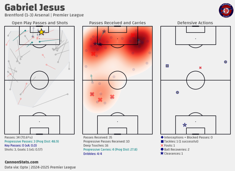 Gabriel Jesus’ impactful performance against Brentford in Arsenal’s 3-1 victory, showcasing his open play passing, shot contributions, progressive carries, and defensive actions. Jesus scored one goal and completed all four of his dribbles. Data by Cannon Stats.Defensively, Jesus was relentless. His eight successful pressures disrupted Brentford’s attempts to play out from the back, while his movement off the ball prevented their defensive line from settling into a rhythm. His heatmap revealed significant activity across the left flank and central channels, showcasing his willingness to adapt his positioning based on the game’s demands.