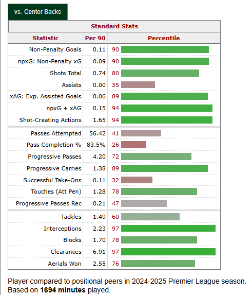 • His progressive passes (72nd percentile) and progressive carries (89th percentile) among center-backs highlight his ability to move the ball forward with confidence.