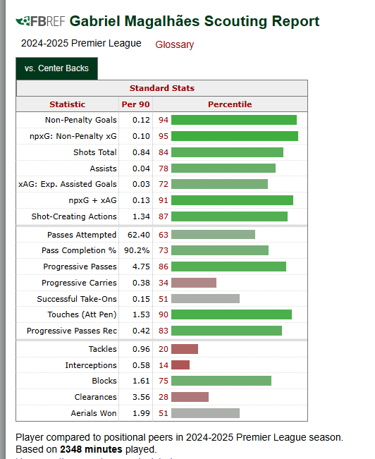 A breakdown of Gabriel Magalhães’ performances this season for comparison purposes. (Stats sourced from FBref.com, based on 2348 minutes played in the 2024-25 Premier League season.) Premier League Experience