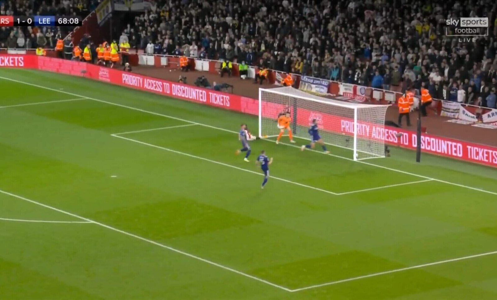 As Leno releases a long kick up the pitch, Nketiah, miracously, manages to get an uncontested header, which he unfortunately passes directly into a Leeds player. Luckily the opponent heads the ball towards his own goal again, which gives Nketiah the chance to put pressure on the defender.