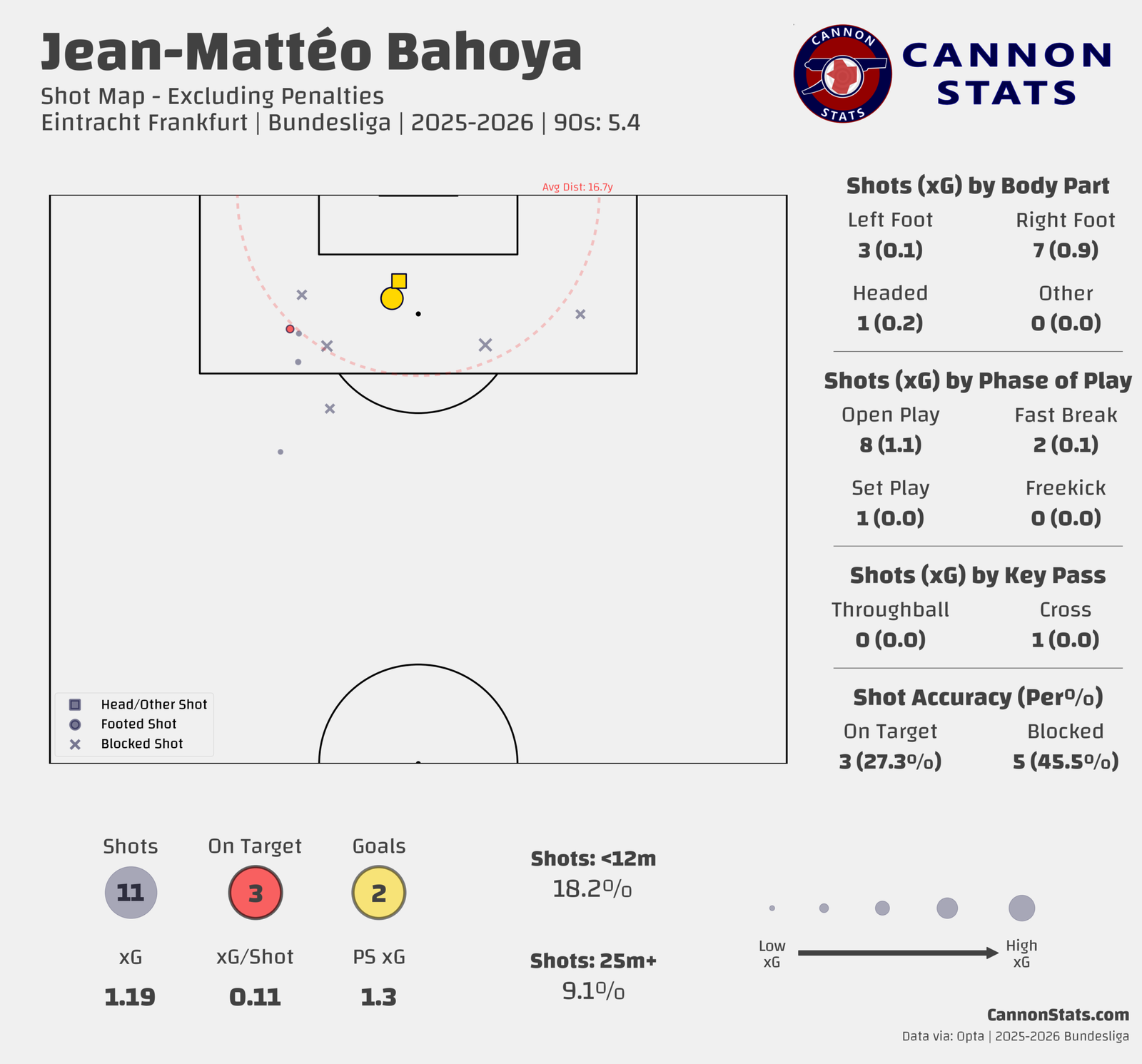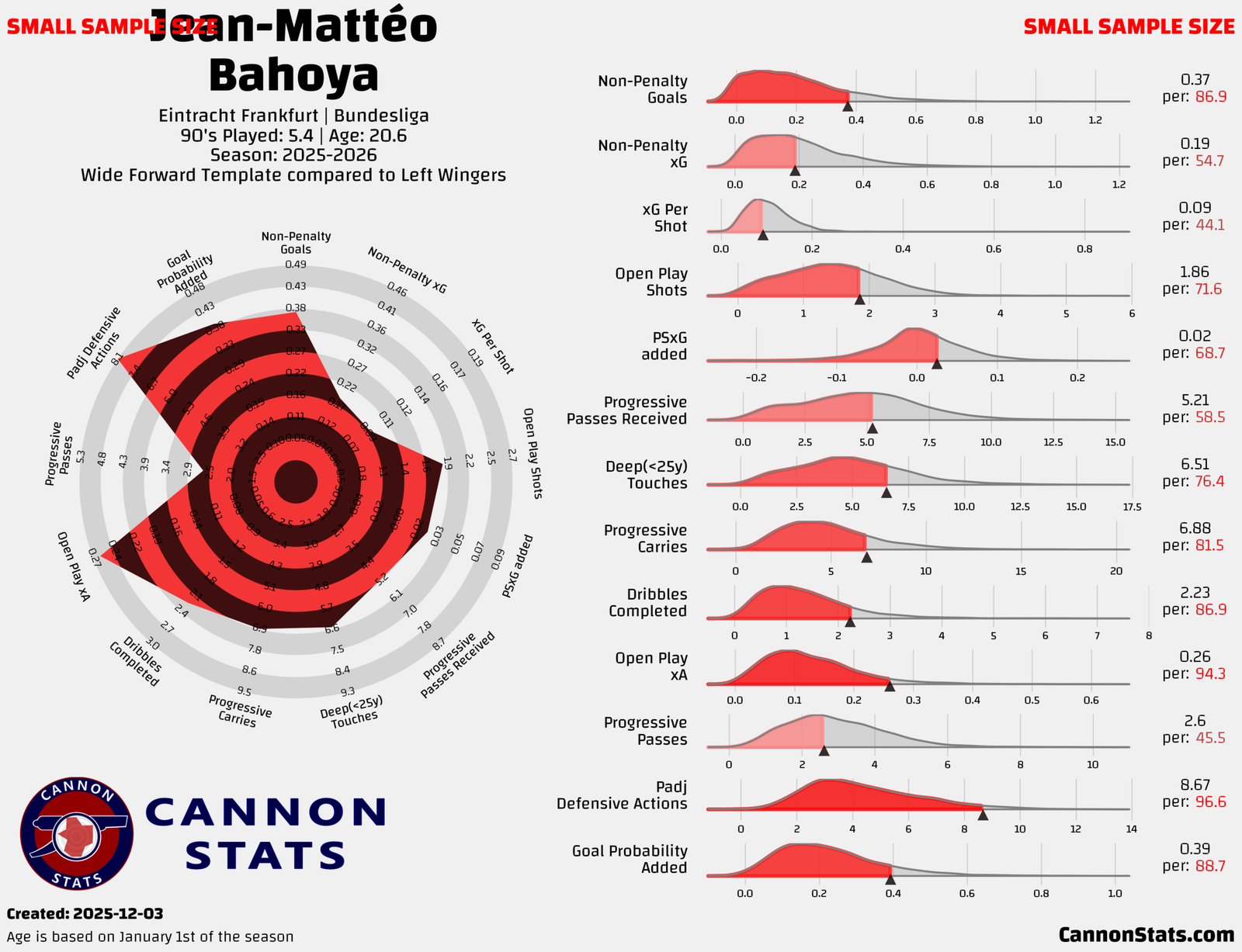 Jean-Mattéo Bahoya is a 20-year-old right-footed attacker at Eintracht Frankfurt. His minutes have come primarily from the left side, split between left wing and left attacking midfield. He has featured regularly this season, though not always as a starter, and has accumulated a modest sample of Bundesliga minutes.
