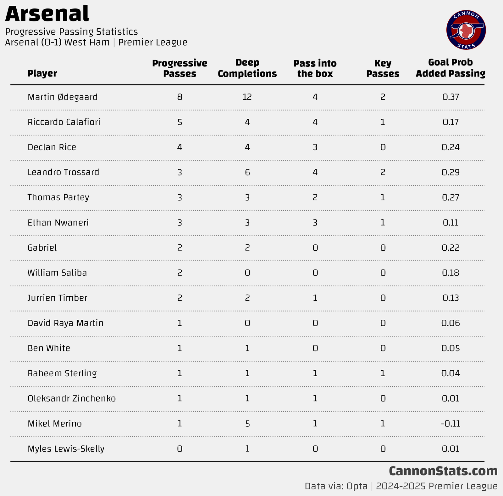 A statistical breakdown of Arsenal’s progressive passing in the match against West Ham, with Martin Ødegaard leading the team in key passing metrics. He recorded 8 progressive passes, 12 deep completions, 4 passes into the box, and 2 key passes, contributing the highest Goal Probability Added (0.37) among all Arsenal players. Despite the team’s struggles in the final third, Ødegaard remained Arsenal’s most influential playmaker. (Courtesy Cannon Stats.)This was not an issue of an individual failing to perform. This was a tactical problem that left Arsenal relying too heavily on one playmaker without providing him with the necessary attacking structure to thrive.