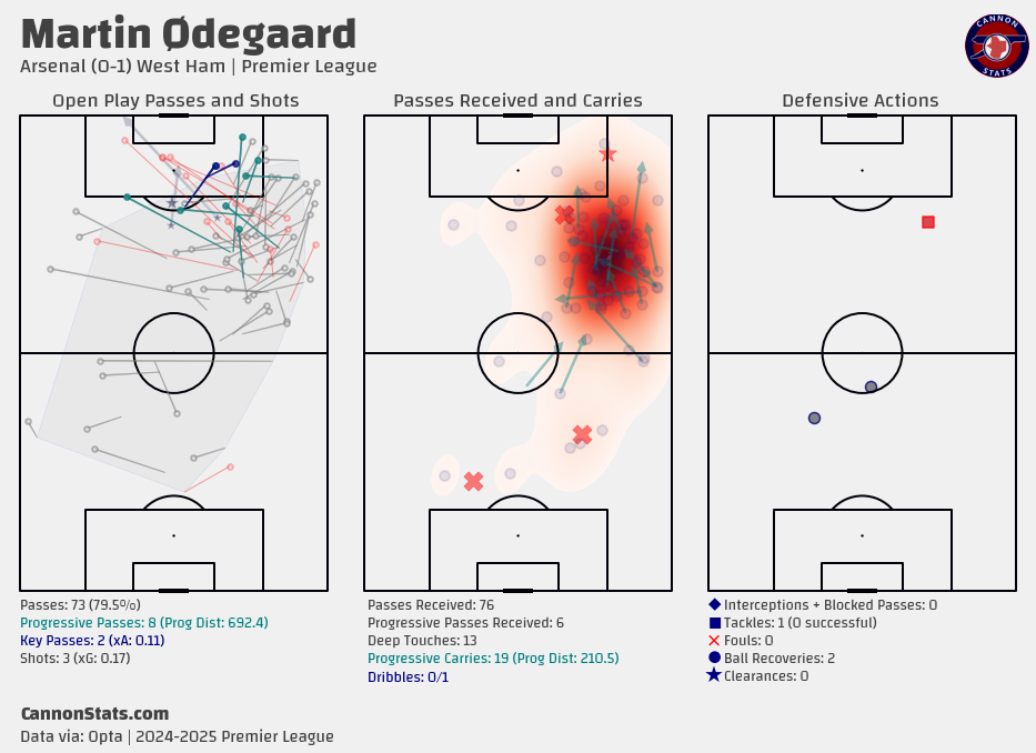 Martin Ødegaard’s Performance vs. West Ham (0-1) – Premier League 2024-25A statistical breakdown of Martin Ødegaard’s contributions against West Ham, highlighting his passing, ball progression, and involvement in Arsenal’s attacking play. (Courtesy Cannon Stats)