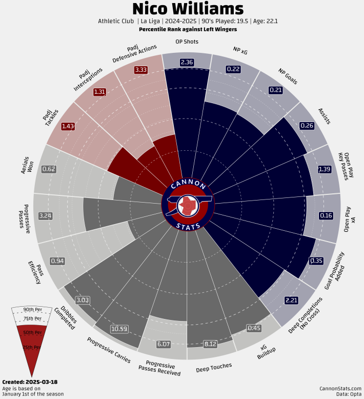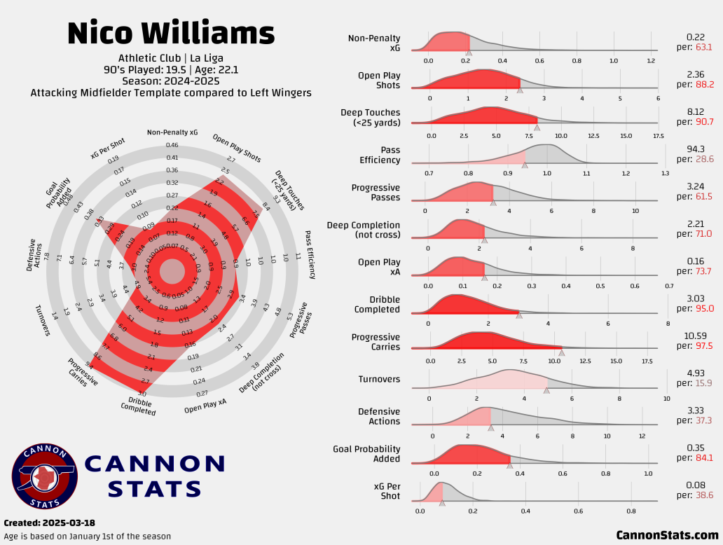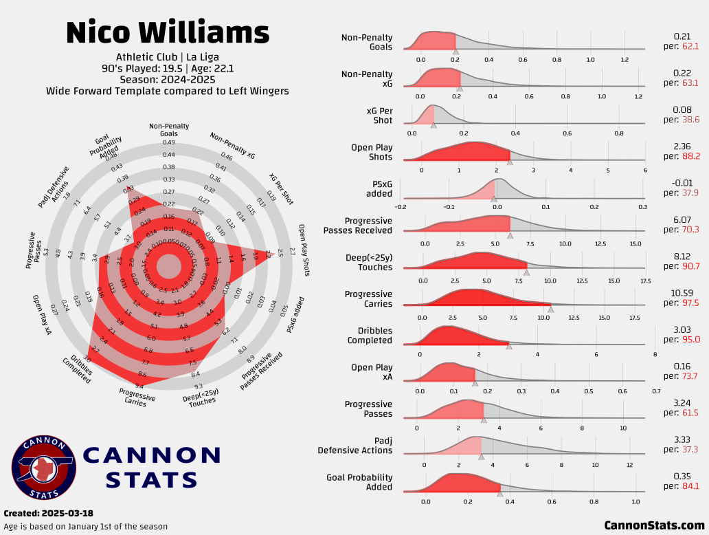 This visualization highlights Williams’ elite dribbling, progressive carries, and deep touches, making him a top ball-progressor among La Liga left-wingers. However, his goal output and defensive contributions remain areas for improvement.Data via Opta | Visualization by Cannon Stats | Created: March 18, 2025