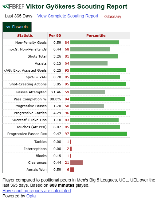 Viktor Gyökeres’ FBref scouting report over the last 365 days highlights his elite attacking metrics—including shot-creating actions, progressive carries, and pass completion—making him one of the most efficient and dynamic centre-forwards in Europe. However, his defensive contribution and aerial presence remain notably low.Source: FBref / Opta, data from last 365 days across Europe’s Big 5 leagues, UCL & UEL (based on 608 minutes played)
