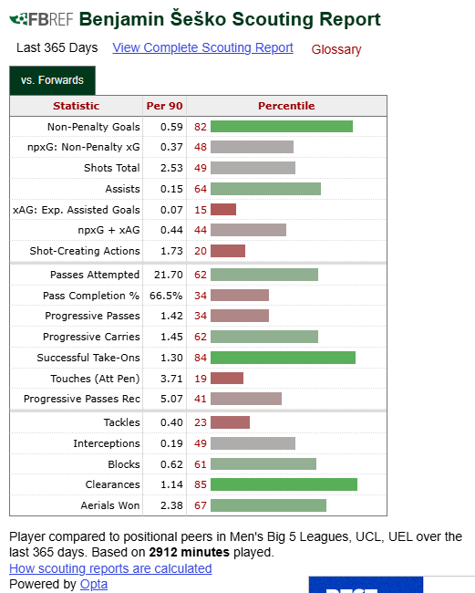 Benjamin Šeško’s FBref scouting report reveals his strong goal-scoring output and aerial presence, alongside impressive take-on success. However, his overall involvement in buildup play and creative metrics—such as shot-creating actions and passing accuracy—remain areas for growth as he continues to mature into a more complete centre-forward. Source: FBref / Opta, data from the last 365 days across Europe’s Big 5 leagues, UCL & UEL (based on 2,912 minutes played)