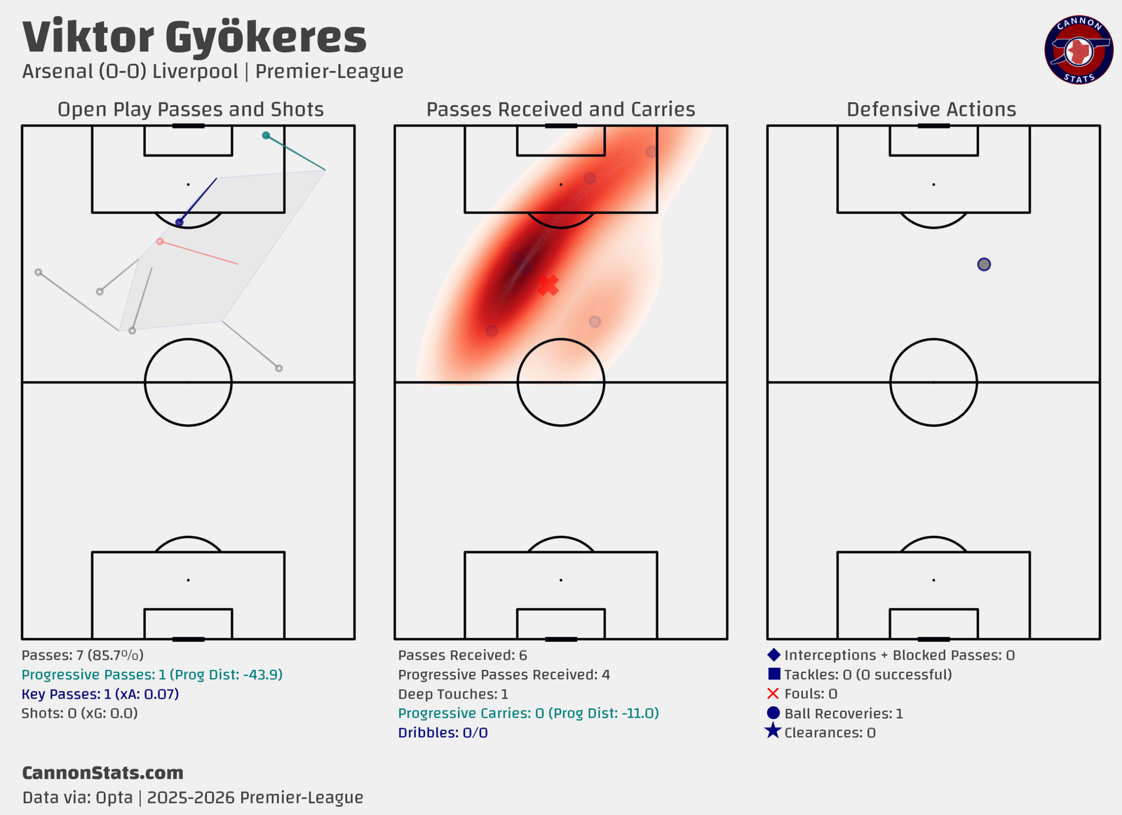 Viktor Gyökeres struggled to influence the game against Liverpool, with limited service, no shots, and most of his touches coming away from dangerous central areas. Source: Cannon StatsArsenal’s best attacking moments came early and from wide. Saka was the main spark in the first half, beating Kerkez and then Mac Allister at times, and getting to the byline. Rice delivered from wide. Timber provided width and presence. Those sequences are how you create chances for a striker like Gyokeres. A ball into the six-yard box. A cut-back into the corridor between keeper and centre-back. One clean pass at the right angle and it is a tap-in or a chaos finish.
